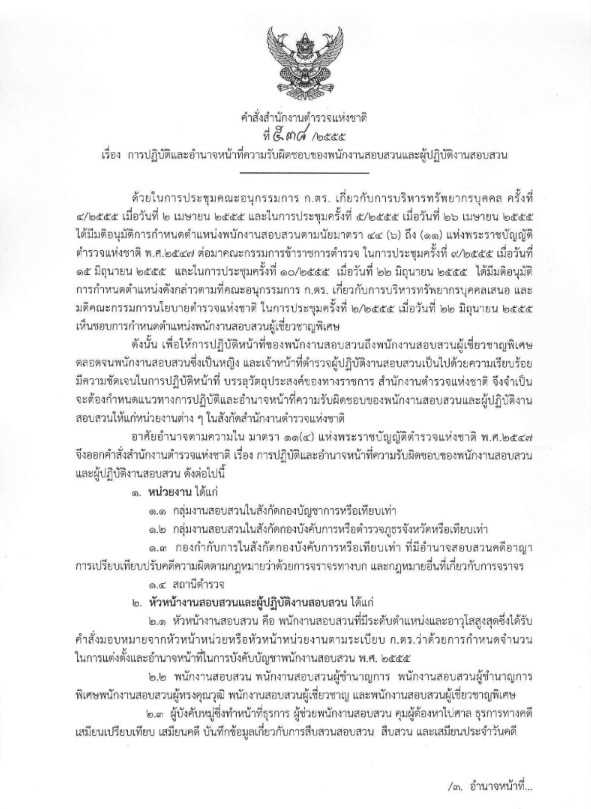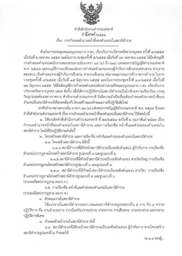 คำสั่ง ตร. 537/2555 กำหนดอำนาจหน้าที่ของตำแหน่งในสถานีตำรวจ